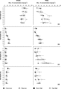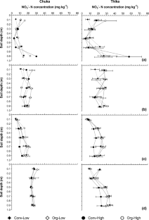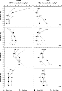 Organic farming has been proposed as a solution to foster agricultural sustainability and mitigate the negative environmental impacts of conventional farming. This study assessed N losses and soil surface N balances in conventional and organic farming systems in a sub-humid and semi-humid (Chuka and Thika) sites in Kenya. Nitrate–N (NO3−–N) leached was trapped at 1 m depth using the Self Integrating Accumulator core method and the changes in mineral-N were assessed at different soil depths and different crop growth stages. Both conventional and organic farming systems lost substantial amounts of NO3−–N at the early growth stages of all the crops. Cumulative NO3−–N leached was similar in all the farming systems in each cropping season. More NO3−–N was leached during potato cropping (22–38 kg N ha−1) than during maize (0.9–5.7 kg N ha−1) and vegetable cropping (1.9–2.9 kg N ha−1). Under maize cultivation, three times more NO3−–N was leached at Chuka site than at Thika site. During the potato cropping, between 79 and 83% of the N applied in the low input systems was leached, compared to 10–20% in the high input systems. Only Org-High exhibited a positive soil surface N balance (797–1263 kg ha−1) over a whole rotation period at both sites. We recommend reducing N applications for potato in all farming systems and at the early growth stages for all the crops in order to reduce N loss to the environment. We also recommend increasing N application rates in the low input systems and to developing a model to guide application of organic inputs.