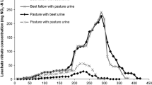 Peak mineral N (NO3−-N + NH4+-N) concentrations measured in the + urine Balmoral soil treatments of our study were generally higher than those of previous studies that measured N losses from urine patches under similar N loading conditions on stony Balmoral soil of grazed forage cropping systems (Hill et al. 2014; Malcolm et al. 2016a), with the exception of those recorded by Carey et al. (2016) who also measured relatively high NO3−-N concentrations (up to approx. 240 mg NO3−-N L−1). They are, however, more aligned with results from studies where urine was applied at higher rates of N, i.e. ≥ 500 kg N ha−1 (Hill et al. 2015; Malcolm et al. 2015). This was also largely the case for total mineral N leaching losses, where mineral N leaching losses measured in our study were closer to those of studies where urine N was applied at higher loads. These differences might be related to the source of N, whereby the studies mentioned above used natural cow urine, while in our study we used synthetic cow urine. Although we used a recognised urine recipe to best replicate natural cow urine, it is likely that other components of natural cow urine [e.g. non-urea nitrogen compounds (Dijkstra et al. 2013; Kool et al. 2006) and carbon compounds related to diet (Peterson, M., unpublished data)] affect the N transformations in urine patch areas, and are likely to create conditions that are more conducive to immobilization, resulting in less N leaching. Recent research results reported by Yao et al. (2018) indicate that there are plant secondary metabolites (PSMs) in the urine from cows grazing on fodder beet and that these PSMs affect the soil nitrification rate.