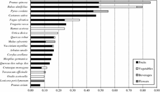 This ethnobotanical study aims to describe the domain of wild edible plants in Gorbeialdea (Biscay, Iberian Peninsula), and to assess the cultural importance of the different species and food categories. Field work was conducted between 2008 and 2010, interviewing 103 informants about the traditional use of wild plants for food. The edible use of 49 species was recorded, 45% of them gathered for their fruits. The most important species coincide with those registered in other regions in the north of the Iberian Peninsula (Prunus spinosa, Rubus ulmifolius, Castanea sativa, Fragaria vesca, Rumex acetosa, Vaccinium myrtillus and Arbutus unedo). However, the importance of some species and uses that had not been previously recorded as edible in the ethnobotanical literature of the Iberian Peninsula, highlights the singularity of the area. The consumption of the leaves of Fagus sylvatica, the seeds of Pinus radiata, and the shoots of Pteridium aquilinum are some examples of specific uses. The eating of the fruits of Quercus robur, and Q. ilex was common until some decades ago and is still remembered by the informants. However, the consumption of those fruits has now a social stigma, and as shown in this paper, it can be overlooked by a methodology only based on open interviews. The most important use-category was ‘fruits’, following the trend found in other northern regions of the Iberian and Italian Peninsulas. ‘Snack vegetables’ is also a relevant category, including 35% of the cited species, with a high diversity of chewed plants, mainly as hunger or thirst quenchers. On the contrary, there was a low valorization of condiments and elaborated vegetables.