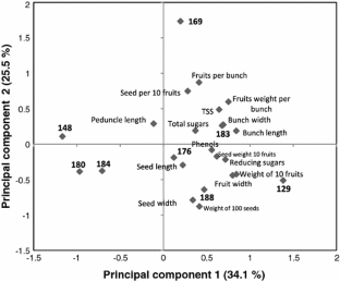 The berries of eight plants of Vitis cinerea Engelm. ex Millardet growing in the mountains of the southern region of the State of Mexico, Mexico, during 2008–2010 (three seasons) were characterized according to the IPGRI descriptor. In addition, the fruit phenolics, total and reducing sugars and total soluble solids (TSS) were determined. Plant 169 produced over 100 fruits per bunch, with a berry weight of 0.32 g; these fruits presented an increased TSS value (20.4°B). The fruit phenolic content was increased in the berries of all the plants (at least 3 mg g−1 fresh weight) compared with the values reported for the commercial cultivars. Principal components 1 and 2 explained nearly 65 % of the observed variance. According to the biplot analysis, three groups were formed. Plants 169 and 183 were correlated with fruits per bunch, seeds per 10 fruits, the weight of berries per bunch, TSS, total sugars, bunch width and length. Plants 176, 188 and 129 were correlated with phenols, reducing sugars, seed weight in 10 fruits, seed length, the weight of 10 fruits, the weight of 100 seeds, and fruit and seed width. Additionally, plants 148, 180 and 184 were associated with peduncle length.