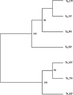 Teak (Tectona grandis L. f.) is a tropical forest tree species naturally occurring in India, Laos, Myanmar and Thailand. The closely related dahat (Tectona hamiltoniana Wall.) is an endemic tree species confined to Myanmar. Two chloroplast Simple Sequence Repeat (cpSSR) and sixty-nine Amplified Fragment Length Polymorphism (AFLP) markers were applied to assess patterns of genetic variation in four T. grandis and three T. hamiltoniana populations in Myanmar. The cpSSR analysis confirmed a clear genetic differentiation between species, revealing a single haplotype (H1) in T. grandis, while the three T. hamiltoniana populations were fixed on different haplotypes (H2 or H3). AFLP analysis revealed that genetic diversity varied between species, showing a slightly higher variation in T. grandis than in T. hamiltoniana. The T. hamiltoniana populations showed similar levels of genetic variation, while parameters varied considerably in T. grandis populations. Analyses of Molecular Variance revealed significant genetic differentiation between the two species (38.4 %, p < 0.05) and among populations within species. Genetic variation mainly resided within populations. Significant pairwise genetic differentiation (pairwise F ST ) was detected between most populations (p < 0.05). An Unweighted Pair Group Method with Arithmetic Mean dendrogram based on Nei’s genetic distances revealed a clear genetic differentiation between species. Diagnostic AFLP markers with complete or nearly complete differentiation between species and complete differentiation at cpDNA markers indicated strong phylogenetic divergence between teak and dahat.
