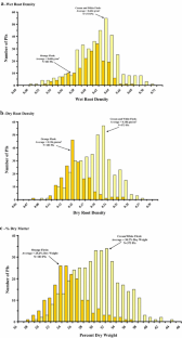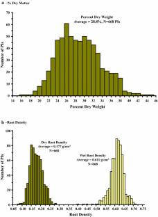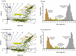 The United States Department of Agriculture (USDA), Agricultural Research Service (ARS), Plant Genetic Resources Conservation Unit in Griffin, GA maintains the United States germplasm collection for Ipomoea spp. (Convolvulaceae). During 2012–2014, 737 sweetpotato, Ipomoea batatas (L.) Lam., plant introductions (PI) were acquired as tissue-culture plantlets and then acclimated to greenhouse conditions at the USDA, ARS, U. S. Vegetable Laboratory (USVL), Charleston, SC. Single plants were transferred to plastic-covered plant beds to produce cuttings for replicated field trials. Storage roots were harvested from 690 PIs grown in the field and 695 PIs grown in pots. Color coordinates were obtained for each PI using a tristimulus colorimeter. Hue angle values (h*) ranged from 8.2° to 88.3° (\( \bar{x} \) = 54.9°) for the periderm (peel or skin) of field-grown storage roots (n = 690 PIs) and − 9.4° (= 350.6°) to 96.2° (\( \bar{x} \) = 51.3°) for pot-grown roots (n = 695 PIs). The red–green coordinate (a*) ranged from 0.8 to 30.7 (\( \bar{x} \) = 12.8) for the periderm of field-grown roots and − 2.0 to 44.9 (\( \bar{x} \) = 16.1) for pot-grown roots. The yellow–blue coordinate (b*) ranged from 2.8 to 33.1 (\( \bar{x} \) = 19.4) for the periderm of field-grown roots and − 7.4 to 38.1 (\( \bar{x} \) = 19.3) for pot-grown roots. Color saturation (chroma, C*) ranged from 13.7 to 35.8 (\( \bar{x} \) = 24.9) for the periderm of field-grown roots and 14.9–45.5 (\( \bar{x} \) = 29.3) for pot-grown roots. Lightness (white–black, L*) ranged from 32.6 to 81.7 (\( \bar{x} \) = 54.6) for the periderm of field-grown roots and 32.1–88.2 (\( \bar{x} \) = 64.0) for pot-grown roots. Hue angles ranged from − 13.1° (= 346.9°) to 100.9° (\( \bar{x} \) = 80.9°) for the stele (flesh) of field-grown storage roots (n = 672 PIs) and − 29.9° to 103.5° (\( \bar{x} \) = 81.6°) for pot-grown roots (n = 676 PIs); a* ranged from − 5.6 to 35.0 (\( \bar{x} \) = 8.0) for the stele of field-grown roots and − 6.0 to 41.0 (\( \bar{x} \) = 7.6) for pot-grown roots; and b* ranged from − 7.7 to 56.1 (\( \bar{x} \) = 34.6) for the stele of field-grown roots and − 12.6 to 56.1 (\( \bar{x} \) = 31.8) for pot-grown roots. C* ranged from 12.7 to 65.8 (\( \bar{x} \) = 37.2) for the stele of field-grown roots and 8.9–65.7 (\( \bar{x} \) = 34.5) for pot-grown roots; and L* ranged from 27.8 to 91.1 (\( \bar{x} \) = 77.7) for the stele of field-grown roots and 28.2–91.9 (\( \bar{x} \) = 80.4) for pot-grown roots. There were significant relationships between stele color (h*) and percent dry matter, with orange stele having a significantly lower % dry matter (\( \bar{x} \) = 25.6%, n = 183) compared with roots with cream/white stele (\( \bar{x} \) = 30.8%, n = 373). There appears to be wide genetic diversity for root color characteristics for the United States sweetpotato germplasm collection.