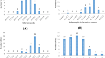 For spatial diversity analysis altitude information grouped into eight classes using Agarwal (1996) formula: \(I = \left( {\frac{L - S}{K}} \right)\); where I is class width; L is the largest (3449 ma.s.l.) and S is the smallest (1410 ma.s.l.) values from altitude records, respectively; K is number of classes obtained from \(K = 1 + 3.322\log_{10}^{n}\); and n is total number of observations, which is 130. Former administrative regional divisions of Ethiopia were used to study the regional diversity in the germplasm.