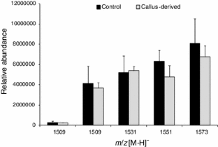 Maesa perlarius is a medicinal plant that produces maesabalides, which possess selective and strong anti-leishmania activity. In this study, M. perlarius plants were regenerated from leaf-derived calli. Shoots were induced in Murashige and Skoog medium in the presence of thidiazuron in combination with α-naphthalene acetic acid. In contrast to seed-derived plants, callus-derived regenerants were tetraploid showing typical characteristics of higher ploidy phenotypes. We assessed the impact of indirect plant regeneration and associated increase in ploidy on the production of saponin by means of LC–MS analysis. Tetraploid M. perlarius produce a saponin profile, which was not significantly different from seed grown plants. Based on this study, we concluded that saponin production in M. perlarius is not qualitatively changed by a genome-doubling event.