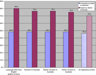 Using data from a recent survey of Australian secondary students, we find that those from higher socio-economic backgrounds are more likely to aspire to attend university. The same can be said for students who do not speak English at home. We find that students with an ethnic minority background are more likely to perceive higher levels of support from parents. However, we find that all students believe they receive encouragement from their parents to do well at school (rather than discouragement or disinterest), and that there is little difference in the level of importance placed on the views of parents between students from English and non-English speaking background. While interest in university education is strong across all socio-economic groups, particularly for students who do not speak English at home, there is a considerable gap between aspirations and enrolment levels. We suggest that this ‘aspirations gap’ is larger for students from low socio-economic backgrounds. This analysis also supports growing evidence that the postcode methodology for allocating socio-economic status to individuals is unreliable.