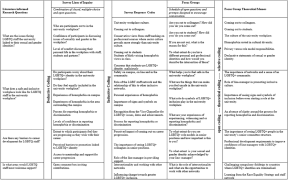 The project utilised an exploratory case study (Yin, 2011) within a social constructivist and interpretivist framework. Case study research promotes the understanding of complex social phenomena and can be used to develop critical thinking (Alvarez, et al., 1990). Case studies strive towards a holistic understanding of cultural systems of action (Feagin, Orum, & Sjoberg, 1990) and cultural systems of action refer to sets of interrelated activities engaged in by the participants or actors in a social situation. Whilst the case study methodology means that generalisations about all university workplaces are not appropriate, the case study approach facilitated a rich picture of the way in which the LGBTQ + university staff experienced their university workplace in a single institution.