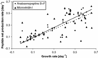 Cyanobacteria produce a large number of bioactive oligopeptides with yet unknown functions. Here the effect of environmental factors on the production of two anabaenopeptins and a microviridin by Planktothrix agardhii was investigated. The results were compared with previous findings on the production of a third family of oligopeptides, the highly toxic microcystins, to test the hypothesis that environmental factors affect the production of different types of cyanobacterial bioactive oligopeptides in a similar manner. Despite marked changes in culture conditions, variations in the amount of cell-bound anabaenopeptins and microviridin I per biomass unit did not exceed a factor of 5. High amounts of cell-bound anabaenopeptins and microviridin I per Planktothrix biovolume were associated with a high availability of nitrogen and phosphorus. The production of anabaenopeptins and microviridin continued as long as the Planktothrix cultures grew. In all cases the oligopeptide net production rate was linearly correlated to the growth rate of Planktothrix, identifying the growth activity as a major regulator of anabaenopeptin and microviridin production. The concentration of anabaenopeptins and microviridins in nature may therefore be estimated from the biomass concentration of their producers. These findings are similar to those previously reported for microcystins and thus support the idea that different types of bioactive cyanobacterial oligopeptides may share common regulation patterns. This may be seen as a hint to a mutual function of cyanobacterial oligopeptides, although further studies are needed to draw final conclusions on this issue.