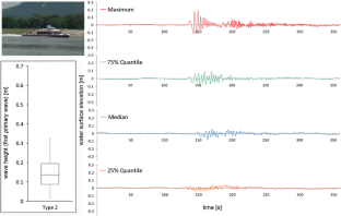 Restoration projects often aim to initiate side erosion processes in order to improve the ecological situation, leading to banks of gentle slopes which positively affect biotic habitats. However, within navigable reaches such measures have to be planned under consideration of the impact of vessel-generated waves on YOY-fish. Hence an extensive study was conducted at different bank types to analyze and describe waves, induced by passing vessels. A high resolution wave gauge was exposed, to obtain wave data of different vessel types over a broad discharge range. Simultaneously vessel passage was recorded using an automatic identification system. Attributed to the ships, different wave types could be distinguished and their specific parameters (e.g., wave height) were described. Additionally we analyzed by which of these parameters wave height is primarily affected. For passenger ships a speed reduction of 5 km h−1 results in a reduction of wave height of 14 cm at the Danube. A morphological analysis was accomplished to identify habitat loss and shift of the water’s edge based on ship induced maximum drawdown. Habitat loss, expressed as retrogression of the water’s edge, ranged between 0.88 and 35 m for the highest drawdown recorded.