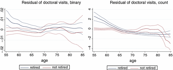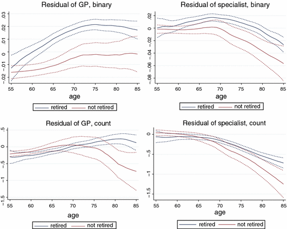 To analyse the dynamics of how retirement influences outpatient care use, I plot the residuals of health care use (controlling for wave dummies and the individual controls used in specification (3), including health indicators, apart from retirement and age) as function of age, by retirement status. The plots of Fig. 1 indicate that the increasing effect of retirement on outpatient care use tends to appear at older ages. The marginal effect of retirement increases with age for all four dependent variables, which is the clearest for the binary indicator of GP visits. Since the typical age of retirement is around 65, the plots suggest that outpatient care use among the retirees is higher even long time after retirement.
