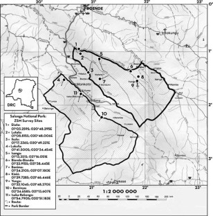 We conducted our work in partnership with the Institut Congolais pour la Conservation de la Nature (ICCN). We are grateful to ICCN Président Délègue Général Malembe Mbo and Bashige Eulalie, who made our missions possible. The Governor of Equateur, the Third Regional Command of the Congolese Armed Forces, the US Embassy-Kinshasa, and the USAID Kinshasa Mission generously provided logistical support and security. We owe a special tribute to those who liberally gave their time: Stefanie Mclaughlin assisted with every aspect of the project, and J. Reinartz helped design the survey and vegetation sampling. P. Dunn, R. Malenky, N. Thompson-Handler, T. Butynski, B. Konstant, E. Van Krunkelsven, D. Messenger, and J. Hall provided expert advice and encouragement; we thank them for years of support. For logistical support, we owe unending gratitude to Steven and Julia Weeks, the conservateurs and park guards of the Salonga National Park, Isomana Edmond, Bekitsi Bunda, Elizabeth and James Williamson, M.K. Koerner, Ntuntani Etienne, Paul Tshanga Tshanga, and the staff of TRAWA, Mbandaka. We also thank M. Hamadi, R. Carroll, N. Laporte, G. Boese, and the Royal Zoological Society of Antwerp. GER benefited from the DISTANCE workshop, RUWPA, University of St. Andrews and advice on covariate analyses from S. Buckland. Suggestions from P. Dunn, R. Malenky, J. Oates and 2 anonymous reviewers, greatly strengthened the manuscript. The Margot Marsh Biodiversity Foundation, the AZA Conservation Endowment Fund, Laacke & Joys-Milwaukee, World Wildlife Fund-US, Conservation Food & Health Foundation, the Beneficia Foundation, Columbus Zoo, Milwaukee County Zoo, M. Jones, L.Weiss, D. and J. Kern, J. Yohe, and private donors generously provided financial support. Landsat™ and radar images were provided courtesy of U of MD and ECOFAC.
