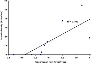 Our study elucidates how forest type characteristics and human presence influence bonobo (Pan paniscus) densities and assesses whether the Salonga National Park harbors a substantial bonobo population. We searched 11 locations in the Salonga for the presence of bonobos and sampled 9 study sites using line transects to estimate relative bonobo nest density, the proportion of forest types, and the intensity of human activity. We classified forests into broad types by overstory and understory composition, canopy cover, and hydrology, and calculated encounter rates for bonobo, human, and large mammal signs. Bonobo signs occurred in 8 of 11 locations but varied widely in frequency. Mean density was 0.72 nest-builders/km2, but density was not uniform across sites (range=0–2.8 nest-builders/km2). Of 11 forest types encountered, the most common were mixed mature forest with an herbaceous (Marantaceae) understory (36.8%), with a woody understory (23.6%), and old secondary forest with a Marantaceae understory (10.5%). Nest sites occurred only in these forest types, called nest-forest types. Bonobo density was highest in locations comprising >80% nest-forest types. Nests occurred more frequently in the mixed mature/Marantaceae forest. Nest-site density correlates positively with the nest-forest patch length we encountered on transects, implying that forest patch size and consistency may influence bonobo density. Mean nest group size correlates positively with proportion of nest-forest types found at a site, suggesting that increased resource availability—nesting sites and food—allows larger group size. A significant inverse association existed between bonobo density and human presence.