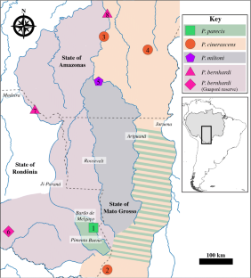 Byrne, H., Lynch Alfaro, J. W., Sampaio, I., Farias, I., Schneider, H., Hrbek, T., & Boubli, J. P. (2018). Titi monkey biogeography: Parallel Pleistocene spread by Plecturocebus and Cheracebus into a post-Pebas Western Amazon. Zoologica Scripta, 47(5), 499–517.