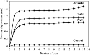 Arthritis was induced in rats, and montelukast (5 mg/kg body wt.) was administered prophylactically (PAM) and therapeutically (TAM) through oral route.