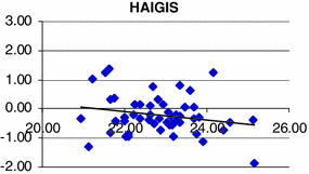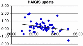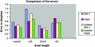To compare the accuracy of the predictions of SRK/T and Haigis formulae, incorporating all the parameters calculated using Zeiss IOLMaster Scan, based on partial coherence interferometry, and to analyse the effect of updating or optimisation of the constants on the post-operative result. A retrospective study was done on 51 consecutive patients, who underwent phacoemulsification by a single surgeon with a temporal corneal incision and a standard Alcon Acrysof MA30 implant in the bag. The pre-operative data were measured using Zeiss IOLMaster scan, and the IOL power calculations were done using both SRK/T and Haigis formulae. The final implant power selection was based on SRK/T predictions. The patients were divided into three groups depending on the axial length, and the post-operative results were analysed at 4 weeks. The difference between the predicted value and the post-operative spherical equivalent was calculated for both the formulae, and a paired t test used for significance. The axial length ranged from 20.93 to 25.16 mm. The error for Haigis was less compared to SRK/T overall and SRK/T resulted in an average hypermetropia 0.69 D and Haigis resulted in an average myopia of 0.16 D. The comparison between SRK/T and Haigis and the updated version of both using the paired t test shows a statistically significant difference, the p values being <0.03 and <0.01, respectively. The updated Haigis Formula with the optimised constants was significantly more accurate than SRK/T formula.