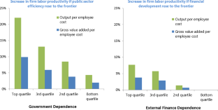 The correlation between the Pellegrino and Zingales (2019) measure of government dependence and the share of output sold to the government is about 0.25. However, the measure based on input–output tables exhibits much wider variation across sectors (the percent of output sold to the government has a median of 0 across sectors, mean of 5, and a standard variation of 17). As reported in Table 3, Panel B, the mean of the Pellegrino and Zingales (2019) measure of government efficiency is 0.65 with a standard deviation of 0.07. A one standard deviation increase in GovDep*GovEff measure is associated with about 6 percent higher output per euro spent on worker. In comparison, a one standard deviation increase in the same measure using the Pellegrino and Zingales (2019) government dependence is associated with 18 percent higher output per euro spent on worker.