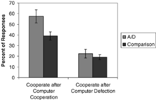 This study examined patterns of behavioral and emotional responses to conflict and cooperation in adolescents with anxiety/mood disorders and healthy peers. We compared performance on and emotional responses to the Prisoner’s Dilemma (PD) game, an economic exchange task involving conflict and cooperation, between adolescents with anxiety/depressive disorders (A/D) (N=21) and healthy comparisons (n = 29). Participants were deceived to believe their co-player (a pre-programmed computer algorithm) was another study participant. A/D adolescents differed significantly from comparisons in patterns of play and emotional response to the game. Specifically, A/D participants responded more cooperatively to cooperative overtures from their co-players; A/D girls also reported more anger toward co-players than did comparison girls. Our findings indicate that A/D adolescents, particularly females, respond distinctively to stressful social interchanges. These findings offer a first step toward elucidating the mechanisms underlying social impairment in youth with internalizing disorders.
