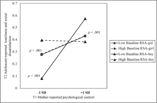 The present study investigated baseline respiratory sinus arrhythmia (RSA) as moderator of the prospective association between parenting (i.e., monitoring knowledge, psychological control) and internalizing symptoms among typically developing adolescents across the transition to middle school. Gender differences in the aforementioned association were tested as an exploratory aim. At Time 1 (5th grade), participants included 100 young adolescents (53% boys; 57% European American; Mage = 11.05 years, SD = 0.33) and their mothers (Mage = 41.25 years, SD = 6.22; 96.0% biological). At Time 2 (6th grade), 89 adolescents and their mothers returned. To address study aims, a multi-informant, multi-method, longitudinal design was used. At Time 1, mothers reported on monitoring knowledge and psychological control, and adolescents’ baseline RSA was measured during a resting baseline period. At Times 1 and 2, adolescents reported on three indices of internalizing symptoms (depressive symptoms, social anxiety, loneliness and social dissatisfaction). Results from multiple regression analyses revealed that higher levels of psychological control predicted higher levels of depressive symptoms and loneliness over time. Further, among boys, lower baseline RSA exacerbated the link between maternal psychological control and higher levels of depressive symptoms and loneliness, whereas higher baseline RSA attenuated the effect. Overall, our findings for boys were consistent with prior evidence of lower baseline RSA as a risk factor and higher baseline RSA as a protective factor against psychopathology. Findings contribute to the growing literature on biopsychosocial interactions and youth mental health.