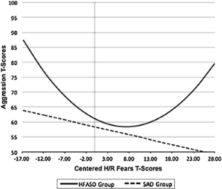 Our conceptual focus in the present study was on humiliation and rejection (H/R) fears. However, we also explored and note herein effects for MASC public performance (P/P) fears for each group. There was a significant group difference on P/P fears (F (2,56) = 4.39, p = .02, η 2p = .14). There was no difference between the HFASD group (M = 47.84, SD = 9.06) and the ODD/CD group (M = 44.75, SD = 11.29), t(56) = .90, p = .37. When collapsed (M = 54.55, SD = 12.54) and compared to the SAD group, the SAD group was higher on P/P fears, t(56) = 19.08, p < .001. In the HFASD group, P/P fears had a significant negative linear effect on aggression (b = −.84, p = .01), but no curvilinear effect, and the overall model was not significant (F (3,15) = 2.99, p = .07). However, it was not possible to differentiate whether the observed linear relationship for P/P fears was qualitatively different from the curvilinear effect for H/R fears or merely an artifact of range restriction in observed P/P fears. In the SAD group, as observed for H/R fears, P/P fears were negatively linearly associated with aggression (b = −.33, p = .01), and the quadratic P/P term did not contribute incrementally. In the ODD/CD group, as observed for H/R fears, neither linear nor quadratic P/P effects predicted aggression scores (F (2,17) = 1.34, p = .29 and F (3,16) = 1.51, p = .25, respectively). In the HFASD group, the inclusion of depression strengthened the relationship between P/P fears and aggression, as was observed for H/R fears. Inclusion of depression did not affect the association of P/P fears and aggression in the SAD or ODD/CD groups.