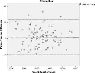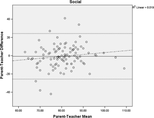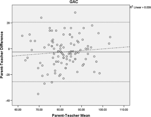 This study examined informant discrepancies for parent and teacher adaptive behavior ratings of 103 children, ages 6–12 years, with ASD (without intellectual disability). Scores on the Adaptive Behavior Assessment System, third edition (Harrison and Oakland, Western Psychological Services, Los Angeles, 2015) General Adaptive Composite (GAC) and practical, social, and conceptual domains were examined for mean differences, level of agreement, and moderators of difference scores between informant groups. Teacher scores were significantly higher (indicating better functioning) than parents for the GAC and practical domain. Parent and teacher scores were moderately correlated and Bland–Altman plots and regression analyses revealed no systematic differences in parent–teacher agreement across the range of scores. None of the tested variables moderated the parent–teacher difference scores. Implications for clinical practice are discussed.