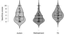 Statistical analyses were conducted with IBM SPSS Statistics 26. As the distribution of our variables of interest did not follow a normal distribution (Shapiro–Wilk tests, p < 0.05), between-group comparisons and correlations were performed with non-parametric statistics (Kruskal–Wallis tests and Spearman correlations). For post-hoc analyses, only adjusted p values are reported to consider Bonferroni correction for multiple tests. For correlations, the Benjamini-Hochberg (BH) multiple comparison correction was applied and therefore only p values that survived BH comparisons are reported. First, groups comparisons were conducted regarding the narratives’ categories (% of specific, extended and categoric narratives) in all conditions. Secondly, the mean experiential index and mean subjective appreciation index were compared across the three groups in all the conditions. We chose not to use IQ as a covariate as lower IQ is part of the neurodevelopmental disorders phenotype (Dennis et al. 2009), and therefore covariating for IQ would remove some of the variance inherent in the diagnosis. However, we examined the link between the FTT and verbal capacities in each group independently as described: spearman correlations were used to examine the associations between FTT and verbal initiation [i.e. verbal fluency animal category (VF)] as well as verbal cognitive abilities [i.e. verbal IQ (VIQ)]. Finally, in order to specifically examine EFT, the scores of differences were compared in term of experiential index and subjective appreciation index between the three groups. Spearman correlations were used to examine the association between EFT variables and AP (i.e. ACIPS) as well as SF (i.e. SRS-2 and VABS-II).
