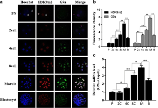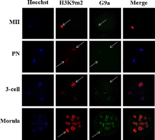 In this study, it was observed that the fluorescence intensity of H3K9m2 and G9a began to increase significantly from the 4-cell stage and reached the peak at the morula stage (p < 0.001), but the fluorescence intensity declined to 4-cell-stage levels when it reached the blastula stage. We observed a similar pattern when we examined G9a mRNA expression. Once the nuclear membrane disintegrated, G9a and H3K9m1 were not detectable by immunofluorescence; when it was reconstructed, G9a and H3K9m1 had relocated to the cell nucleus. However, no significant change was observed in the H3K9m2 localization or in the G9a mRNA level (p > 0.05) during the whole process. JHDM2A was consistently localized in the cytoplasm irrespective of the presence or absence of a nuclear membrane.