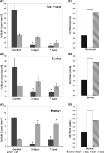 Evidence of extensive primordial follicle (PMF) activation and loss was observed already 3 days post transplantation in marmoset, bovine, and human tissue grafts, compared to frozen-thawed untransplanted controls (p < 0.001). No significant additional PMF loss was observed 7 days post transplantation. Recovered grafts of all species showed markedly higher rates of proliferative activity and progression from dormant to growing follicles (Ki-67 and GDF9 staining) as well as higher growing/primordial (GF/PMF) ratio (p < 0.02) and higher collagen levels compared with untransplanted controls.