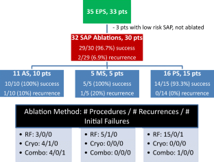 Thirty-three patients with SAP underwent 35 EP studies: AS (n = 13), MS (n = 5), and PS (n = 15). Thirty pathways were targeted for ablation, two of which required a 2nd procedure resulting in 32 attempts at ablation in 30 patients. In the remaining 3 patients, SAP did not have malignant features and were not targeted for ablation. Single-procedure success rate was 28/30 (93.33%): 9/10 AS, 5/5 MS, and 14/15 PS ablations. One AS pathway was successfully ablated during a 2nd procedure. Two complications were observed: 1 pericardial effusion in a patient who underwent epicardial mapping and ablation of both PS and right free wall APs. Additionally, transient 2:1 AV block occurred during an MS pathway ablation that recovered during follow-up and did not require permanent pacing procedure.
