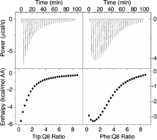 Cong et al. report a 1:1 (Q8:amino acid) stoichiometry for Q8 with tryptophan and tyrosine and a 2:1 stoichiometry with phenylalanine on the basis of continuous variation experiments by UV-visible spectroscopy. This method, however, does not provide reliable stoichiometric constants if higher order dissociation constants are significantly greater than the working concentration.
