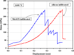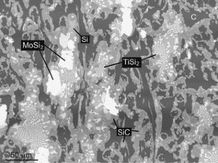 The development of a Cf/(Mo, Ti)Si2–SiC composite using melt infiltration technique was investigated. C/C preforms and also Cf-felts were infiltrated with an alloyed melt of Si, Ti and MoSi2. The amount of each element was selected so that the melting point of the alloy was lower than 1600 °C. It was then possible to prevent the melt from reacting heavily with the carbon fibers and preserve their reinforcing effect in case of the C/C preforms. After infiltration no residual silicon could be detected in the matrix of the infiltrated C/C composites. The infiltrated C/C samples reached a maximum bending strength of 210 MPa at room temperature. At 1600 °C there is even an increase in their bending strength to 250 MPa. Infiltrated felts showed monolithic and brittle characteristics. Their bending strength at room temperature was not higher than 150 MPa. Because of softening of the residual silicon, the strength of the infiltrated felts was reduced at high temperatures. The felt samples which were infiltrated with an alloyed melt showed higher mechanical strength than pure silicon infiltrated felts both at room temperature and at 1600 °C.