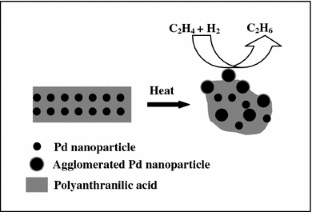 A facile synthesis route is described here for the preparation of a poly (anthranilic acid)-palladium nanoparticle composite material by polymerization of anthranilic acid (AA) monomer using palladium acetate (PA) as the oxidant. It was found that oxidative polymerization of AA leads to the formation of poly-AA (PAA), while the reduction of PA results in the formation of palladium nanoparticles with an average size of ~2 nm. The palladium nanoparticles were uniformly dispersed and highly stabilized within the macromolecular matrix resulting in a uniform metal–polymer composite material. The resultant composite material was characterized by means of different techniques, such as IR and Raman spectroscopy, which yielded information about the chemical structure of polymer, whereas electron microscopy images provided information concerning the morphology of the composite material and the distribution of the metal particles in the composite material. The composite material was tested as a catalyst for ethylene hydrogenation reaction and showed a catalytic activity at higher temperatures.