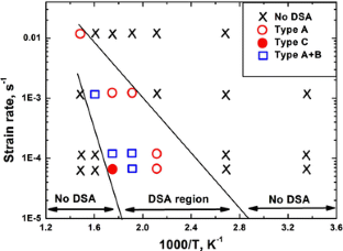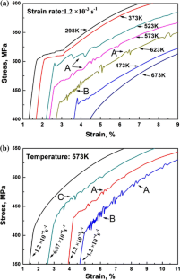 An as-received reactor pressure vessel (RPV) steel SA508 class 3 (SA508 Cl.3) has been subjected to uniaxial tension tests in the strain-rate range of 6.67 × 10−5 s−1 to 1.2 × 10−2 s−1 and the temperature range of 298 K to 673 K to investigate the effects of temperature and strain rate on its mechanical properties. It was found that the region of dynamic strain aging (DSA) was in the temperature range of 523–623 K at a strain rate of 1.2 × 10−3 s−1, 473–573 K at 1.2 × 10−4 s−1, and 473–573 K at 6.67 × 10−5 s−1, respectively. Serrated stress–strain behaviors, predominately consisting of type A, B, and C, have been observed in these temperatures and strain-rate ranges. The solutes responsible for DSA have been identified to be carbon and nitrogen, and nitrogen atoms play a more important role. The relative DSA mechanisms for this RPV steel are discussed.