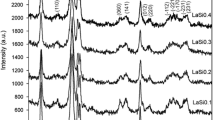The X-ray diffraction studies were performed for samples of various compositions to identify the components formed during the thermal treatments. The XRD patterns of SiO2–La2O3 samples calcined at 500 °C in atmosphere of oxygen are presented in Fig. 1. The X-ray diffraction scans of silicon dioxide and binary oxide system proved that the samples had amorphous nature even for the largest quantity of lanthanum used. Amorphous phases cannot be detected directly by X-ray diffraction analysis, because they do not produce additional visible reflexes in the XRD diagram, but only increase the background and wide range halo. Meanwhile, the lanthanum oxide showed eight characteristic peaks, which are indexed on the basis of a hexagonal unit cell with the lattice parameters of a = 3.94094(21)Å, c = 6.13207(35)Å, and the space group of a P-3m1 [22, 23]. The SiLa 1.0 (ratio Si/La 1:1) sample treated at 800, 1000 and 1200 °C (Fig. 2), crystallized in two oxides: monoclinic lanthanum silicon silicate oxide, La6Si4(SiO4)2O13, [04-010-8687] and hexagonal lanthanum silicate oxide La9.31(Si1.04O4)6O2, [01-076-0340]. The structure refinements were performed using the program FullProf [24]. Crystalline phase identification was carried out using the diffractometer analytical software after revision of the PDF4 + (2011) 4.11.0.3 ICDD database crystalline compounds [25].