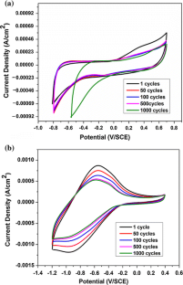 In the present work we report ferric oxide (α-Fe2O3) and conducting polyaniline–ferric oxide (PANI–Fe2O3) composite thin films prepared using simple electrodeposition technique. The structural and morphological analysis was carried out by X-ray diffraction and scanning electron microscopy. The supercapacitive properties of these films were examined using cyclic voltammetry, charge–discharge studies, and electrochemical impedance spectroscopy in 0.5 M Na2SO4 electrolyte. It is observed that the PANI–Fe2O3 composite electrode delivered higher specific capacitance than individual α-Fe2O3. Also the composite thin film electrode exhibits excellent specific capacitance retention of about 87 % over 1000 CV scan cycles as compared to α-Fe2O3 electrode, which exhibits only 84 % retention capacity.