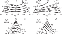 Keeping in mind the brief description of the CFM method, the mixing Gibbs free energies (Gmix) were computed at 1345 K assuming the presence of two “associate” types, i.e. Al2Cu and Al2Cu3; the results are plotted in Fig. 1. The interaction energy parameters W ij , used for fitting Gibbs free energy to the one computed employing the Redlich–Kister (RK) polynomial (solid line in Fig. 1), are given in Table 1 in the form of their temperature dependence for both associate types considered. Here, the RK’s Gibbs energies are those computed using thermodynamic parameters (iLLiq, i = 0, 1, 2, 3) taken from Witusiewicz et al. [44] to Redlich–Kister polynomial [41] and they are collected in Table 1.