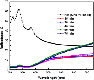 In this work, upgraded metallurgical grade silicon (UMG-Si) wafer was used to fabricate mesoporous nanostructures, as an effective antireflection layer for solar photovoltaic cells. The length of the vertical Si nanostructure (SiNS) arrays was altered by varying the etching time period during metal assisted chemical etching process, using a silver catalyst. The optical, structural, morphological changes and the antireflection properties of Si nanostructures formed on UMG-Siwafer were analysed. SEM and photoluminescence studies indicate that Si nanocrystals are formed on the surface and along the vertical nanowires. The pore size depends on the Ag nanoparticle size distribution. All the samples demonstrated a luminescence band centred around 2.2 eV. From the optical results, samples etched for 45 min show strong absorption in the visible spectrum. The minimum and maximum surface reflectance in the visible region was observed for 15 min and 60 min etched SiNS. Based on the observed results, 15 min etched Si with a uniform porous structure has minimum reflectance across the entire silicon UV–Vis absorption spectrum, making it worth further investigation as a candidate for use as an antireflection layer in silicon based solar cells.