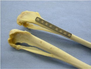 In order to investigate bone tissue reaction to the low rigidity titanium alloy of TNTZ in bone plate fixation, animal experiment with rabbit was performed with X-ray follow-up and histological observation. Experimental fractures were made in rabbit tibiae, and fixed by different bone plates of SUS316L, Ti–6Al–4V and TNTZ. Although there was no significant difference in fracture healing, bone atrophy was observed in cortical bone especially under the bone plate, which was different in time course among three materials. The bone atrophy under the bone plate was confirmed as porous or poor bone tissue in histological observation. In addition, the diameter of the tibia bone was increased in TNTZ as the result of bone remodeling with a new cortical bone. It is confirmed that the elastic modulus of the bone plate will naturally influence bone tissue reaction to the bone plate fixation according to the Wolff’s law of functional restoration.