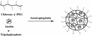 The development of injectable nanoparticulate “stealth” carriers for protein delivery is a major challenge. The objective of this work was to investigate the possibility of achieving the controlled release of a model protein, insulin, from PEG-grafted chitosan (PEG-g-chitosan) nanoparticles (mean diameter 150–300 nm) prepared by the ion gelation method. Insulin was efficiently incorporated into the nanoparticles, and reached as high as 38%. In vitro release showed that it could control the insulin release by choosing the composition, loading and release temperature. We observed that the composition of the nanoparticle surface (C/O ratio) increased from 2.40 to 3.23, with an increase in the incubation time. Therefore, we concluded that during this time, insulin release from PEG-g-chitosan nanoparticles followed a diffusion mechanism in which erosion was negligible. The experiments also demonstrated that PEG-g-chitosan helped to maintain the natural structure of the protein entrapped in the nanoparticles.