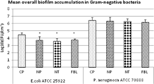 Orthopaedic device-related infections are closely linked to biofilm formation on the surfaces of these devices. Several modified titanium (Ti-6Al-4V) surfaces doped with fluorine were studied in order to evaluate the influence of these modifications on biofilm formation by Gram-positive and Gram-negative bacteria as well as a yeast. The biofilm studies were performed according to the standard test method approved by ASTM (Designation: E2196-12) using the Rotating Disk Reactor. Four types of Ti-6Al-4V samples were tested; chemically polished (CP), two types of nanostructures containing fluorine, nanoporous (NP) and nanotubular (NT), and non-nanostructured fluorine containing samples (fluoride barrier layers, FBL). Different species of Gram-positive cocci, (Staphylococcus aureus and epidermidis), Gram-negative rods (Escherichia coli, Pseudomonas aeruginosa), and a yeast (Candida albicans) were studied. For one of the Gram-positive (S. epidermidis) and one of the Gram-negative (E. coli) species a statistically-significant decrease in biofilm accumulation for NP and NT samples was found when compared with the biofilm accumulation on CP samples. The results suggest an effect of the modified materials on the biofilm formation.