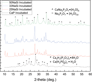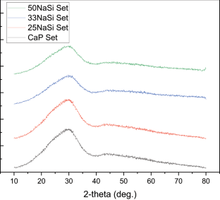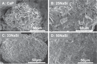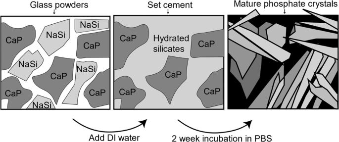 Evaluation of the physicochemical behavior and setting reactions of a novel inorganic pulp capping cement which makes use of the unique corrosion properties of sodium metasilicate (NaSi) glass. NaSi and calcium phosphate (CaP) glass powders were synthesized through a melt-quench method. Cements were created by mixing various amounts of the glasses with deionized water at a powder-to-liquid ratio of 2.5 g mL−1. Working and setting times were measured using the indentation standard ISO 9917-1. Sealing ability was tested by placing set samples of each composition in methylene blue dye solution for 24 h. Set samples were also submerged in phosphate buffered saline and incubated at 37 °C for one week. X-ray diffraction was used to identify mature crystalline phases after incubation. Infrared spectroscopy and scanning electron microscopy were used to characterize cements before and after setting and after incubation. Working and setting times measured in the ranges of 2–5 and 10–25 min, respectively. Working and setting time generally decrease with increased NaSi concentration. Cements with compositions of 25 and 33 wt% NaSi were found to resist the infiltration of dye and maintain their shape. Compositions outside this range absorbed dye and collapsed. Infrared spectroscopy provided insight into the setting mechanism of these cements. After one week in vitro, cements were found to contain crystalline phases matching chemically stable, bioactive phases. The combination of NaSi and CaP glasses has favorable setting behavior, sealing ability, and mature phases for pulp capping while relying on a relatively simple, inorganic composition.