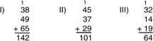 Mrs. Jackson is getting ready for the state assessment, and is planning mini-lessons for students focused on particular difficulties that they are having with adding columns of numbers. To target her instruction more effectively, she wants to work with groups of students who are making the same kind of error, so she looks at a recent quiz to see what they tend to do. She sees the following three student mistakes: