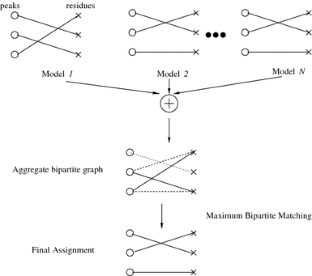 We now show that our voting rule, MBM, is the MLE of the correct assignments. In our setting, there is a ground truth winner, which is the correct (and unknown) (peak, residue) assignments. The individual votes correspond to the assignments made using each of the structures in the NMA ensemble separately using an SBA algorithm (Fig. 2). The MBM is done on a BPG where one set of nodes corresponds to peaks and the other set to residues. The edge weights are the number of structures that assign (“vote for”) the corresponding (peak, residue) pair.