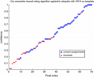 We assume the following noise model: For each template in the ensemble (“voter”), each peak is correctly (resp., incorrectly) assigned with probability p (resp., q) where p > q, independent of other peaks, and such that if the resulting assignments have more than one peak assigned to the same residue, each peak is reassigned (again with probability p to the correct residue and probability q to an incorrect residue). We further assume that the assignments corresponding to individual models are independent, given the correct assignments. So, the noise is independent and identically distributed.
