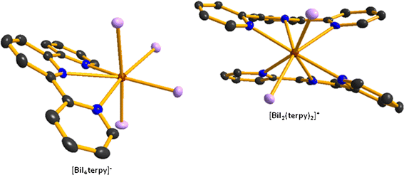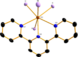 A new iodobismuthate of formula [BiI2(terpy)2][BiI4(terpy)] (terpy = 2,2′:6′,2′′-terpyridine), was prepared solvothermally in an ethanolic mixture composed of bismuth (III) iodide, terpy, and ruthenium (III) iodide. The compound crystallizes in the space group P \( \bar{1} \), with Z = 2, a = 9.8491(4) Å, b = 15.4181(7) Å, c = 17.5323(8) Å, α = 89.8140(10)°, β = 80.4160(10)°, γ = 77.9020(10)°. Single-crystal X-ray analysis reveals that the compound is composed of a [BiI2(terpy)2]+ cation and a [BiI4(terpy)]− anion. It is an uncommon example where an iodobismuthate cation and anion are simultaneously incorporated into the same crystal structure.