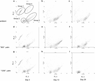 Effects of nutrient enrichment on 400-L coastal phytoplankton community cultures were examined under 3 pCO2 levels [ambient (400), 800 and 1200 μatm]. Three days after addition of the nutrients, rapid increases in phytoplankton pigments and cell numbers were noticed. Relative growth rates of diatoms and dinoflagellates were higher than prasinophytes and haptophytes during early stages of the culture experiment, and only limited effects of increased CO2 were observed on nutrient consumption, biomass and cell numbers. Ocean acidification showed significant effects on phytoplankton composition during the post-blooming period with negligible dissolved nutrients; up to 70 % of total cells were picoplankton in the 1200-μatm condition as compared to 20 % in the ambient condition. An increase in chlorophyll b and a flow cytometry analysis of the cultured strains strongly suggested Micromonas-like (Prasinophyceae) picoplankton dominated in the acidified conditions. It is likely that the effects of ocean acidification are significant in low-nutrient conditions such as during the post-blooming period.