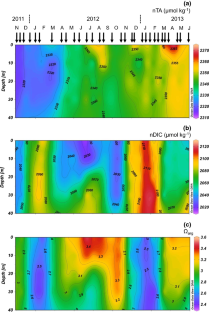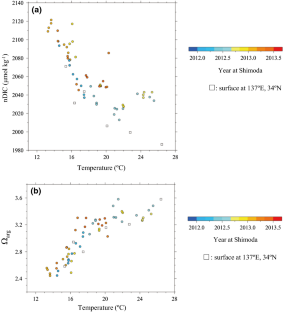 To elucidate how variables of the seawater CO2 system in surface waters have been changing seasonally and the mechanisms responsible for these changes in the area off the south coast of central Honshu Island, Japan, we made time-series measurements of total dissolved inorganic carbon (DIC), total alkalinity (TA), inorganic macronutrient and chlorophyll a concentrations as well as temperature and salinity at a near-shore station off Shimoda city near the southern tip of the Izu Peninsula over 19 months from November 2011 to June 2013. The oceanographic setting in our study site is characterized by seasonal stratification, low salinity in summer, and well-mixed water column in winter. A large bloom of phytoplankton developed in spring, thereafter nutrients were depleted within the mixed layer in summer. DIC exhibited large seasonal variations and ranged from 1967 µmol kg−1 in summer to 2073 µmol kg−1 in winter when normalized to a salinity of 35, because of biological production in the spring and summer and vertical mixing in autumn and winter, as shown by multiple regression analysis in which variations of normalized DIC (nDIC) are estimated from variations in temperature (13.3–25.5 °C) and chlorophyll concentrations (0.27–3.9 μg l−1). We observed a decrease of TA due to dilution by precipitation and river runoff in summer and a trend of salinity-normalized TA increase over time. The saturation state of the calcium carbonate mineral aragonite Ωarg varied seasonally from 2.40 in winter to 3.58 in summer. The Ωarg in the present study was calculated using DIC, TA, temperature and salinity, and we applied sensitivity analysis for these parameters. Ωarg was predominantly controlled by the large variations of DIC. The combination of these results from the station off Shimoda and from an offshore station at 34° N, 137° E to the west allow us to predict Ωarg with high precision for temporal and spatial variations. It suggests that in winter, there is a meridional gradient of Ωarg in the region off the southern coast of central Honshu Island, with considerably lower Ωarg in the coastal zone.