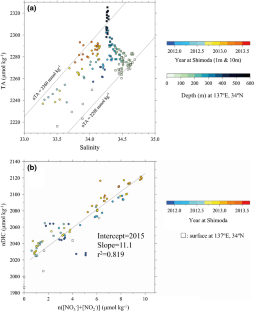 Takatani Y, Enyo K, Iida Y et al (2014) Relationships between total alkalinity in surface water and sea surface dynamic height in the Pacific Ocean. J Geophys Res Oceans 119:2806–2814. https://doi.org/10.1002/2013JC009739