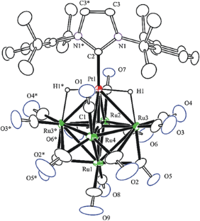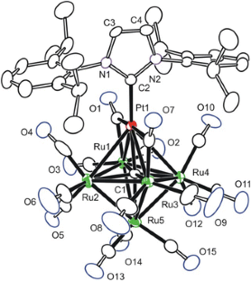 The reaction of Pt(IPr)(SnBu t3 )(H), 1 [IPr = N-heterocylic carbene ligand N,N ′-bis-(2,6-(diisopropyl) phenyl)imidazol-2-ylidene] with Ru5(μ 5 -C)(CO)15, 2, in 1.2:1 (and 2.2:1) ratio in benzene solvent at refluxing temperature afforded the octahedral monoplatinum–pentaruthenium cluster complexes PtRu5(IPr)(CO)15(μ 6 -C), 3 in 54 % (10 %) yield, PtRu5(IPr)(CO)14(H)2(μ 6 -C), 4 in 6 % (10 %) yield and the diplatinum–pentaruthenium cluster complex Pt2Ru5(IPr)2(CO)15(μ 6 -C), 5 in 2 % (36 %)yield. Complex 3 readily reacts with H2 at room temperature to give complex 4. Compound 5 exhibits dynamical activity in solution where the two Pt(IPr) groups are exchanging rapidly. All three compounds were structurally characterized by single-crystal X-ray diffraction analyses.