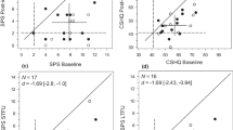 Two effect size measures were calculated for SPS and CSHQ group data using Lakens (2013) software: The within-subjects Cohen’s dav (Cohen, 1988; Lakens, 2013) and the Percent Superiority Effect Size (PSES, also known as the Common Language Effect Size; McGraw & Wong, 1992). Cohen’s dav effect sizes were interpreted based on the criteria developed by Cohen (1988): Small effect dav ≤ 0.2, medium effect dav = ~ 0.5, and large effect dav ≥ 0.8. A reduction in SPS and CSHQ scores from pre- to post-treatment reflect change in a clinically desirable direction, represented by negative dav values. The PSES represents the probability (expressed as a percentage) that a randomly selected participant will have a post-treatment score clinically better than their pre-treatment score (Lakens, 2013; McGraw & Wong, 1992). Confidence intervals (CI) about dav (calculated using Cumming, 2012) were also calculated to classify dav as reliably different from zero (p < 0.05). Due to the small sample size, effect size calculations are based on autistic and RGND participants, combined.