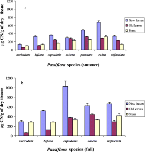 Nahrstedt, A. and Davis, R. H. 1983. Occurrence, variation, and biosynthesis of the cyanogenic glucosides linamarin and lotaustralin in the species of Heliconiini (Insects: Lepidoptera). Comp. Biochem. Physiol. 75B:65–73.