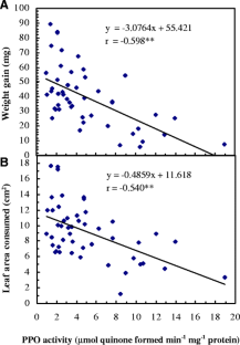 Tomato (Solanum lycopersicum) polyphenol oxidases (PPOs), enzymes that oxidize phenolics to quinones, have been implicated in plant resistance to insects. The role of PPO in resistance to cotton bollworm [Helicoverpa armigera (Hübner)] and beet armyworm [Spodoptera exigua (Hübner)] (Lepidoptera: Noctuidae) was evaluated. Consumption, weight gains, and mortality of larvae feeding on foliage of transgenic tomato lines overexpressing PPO (OP lines) and of larvae feeding on foliage of transgenic tomato lines with suppressed PPO (SP lines) were compared with consumption, weight gains, and mortality of larvae feeding on non-transformed (NT) plants. Increases in foliage consumption and weight gains were observed for cotton bollworms feeding on leaves of SP plants compared to NT and OP plants. PPO activity was negatively correlated with both weight gains and foliar consumption of cotton bollworm, substantiating the defensive role of PPO against this insect. Similarly, beet armyworm consumed less foliage (both young and old leaves) from OP plants than SP plants. Larvae feeding on OP leaves generally exhibited lower weight gains than those feeding on SP leaves. These results indicate that tomato PPO plays a role in resistance to both cotton bollworm and beet armyworm.